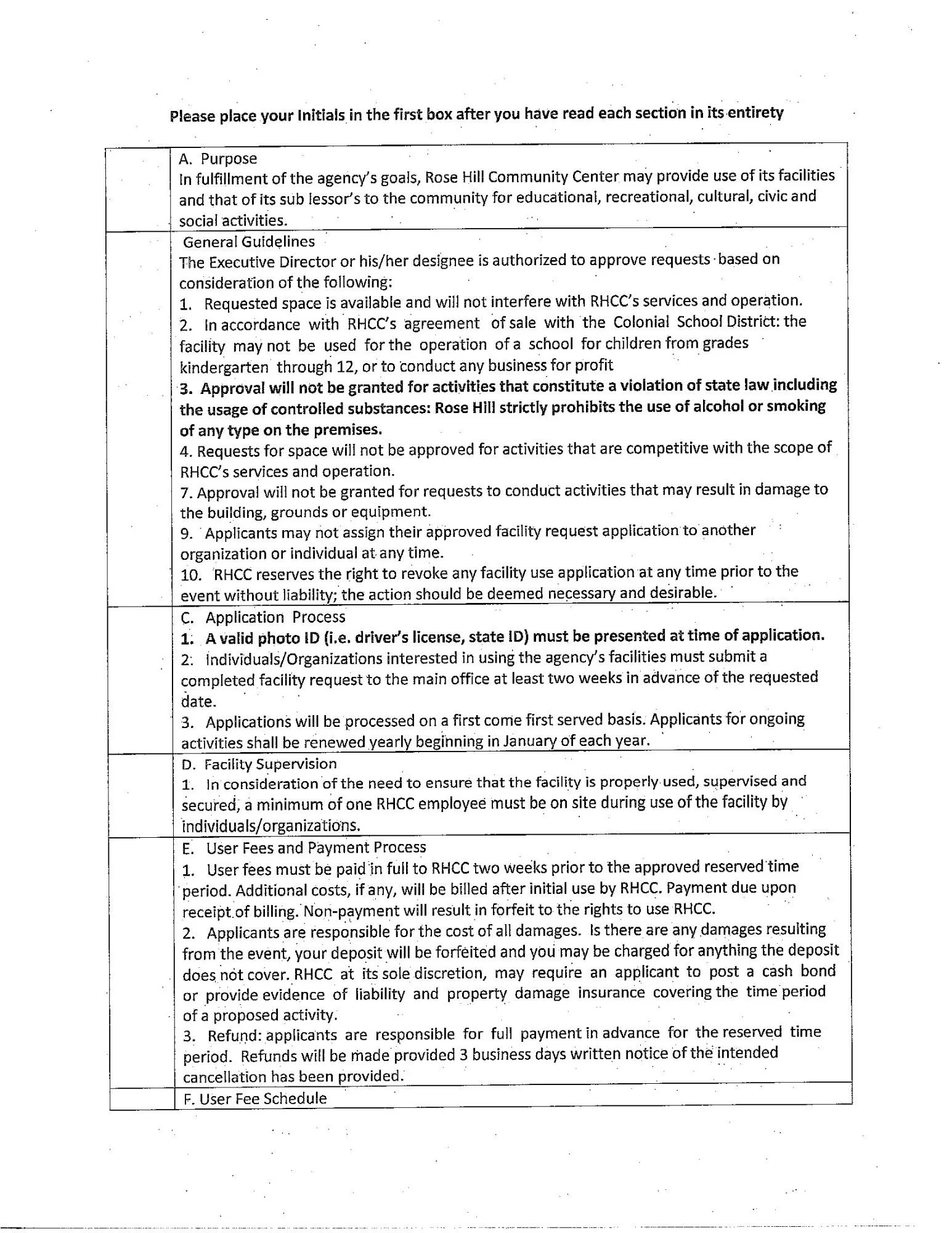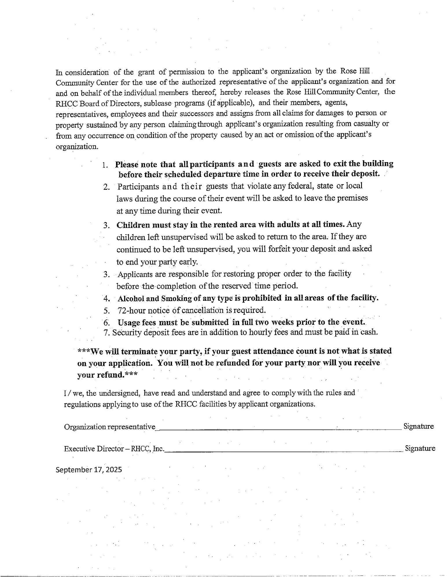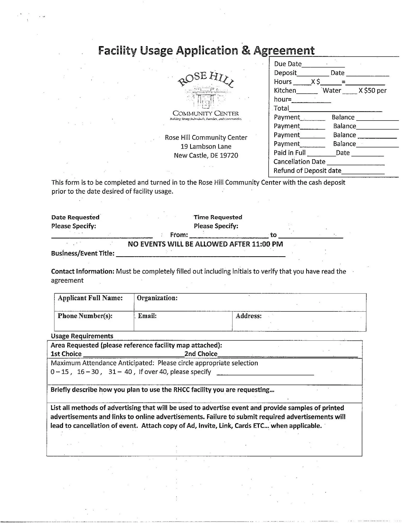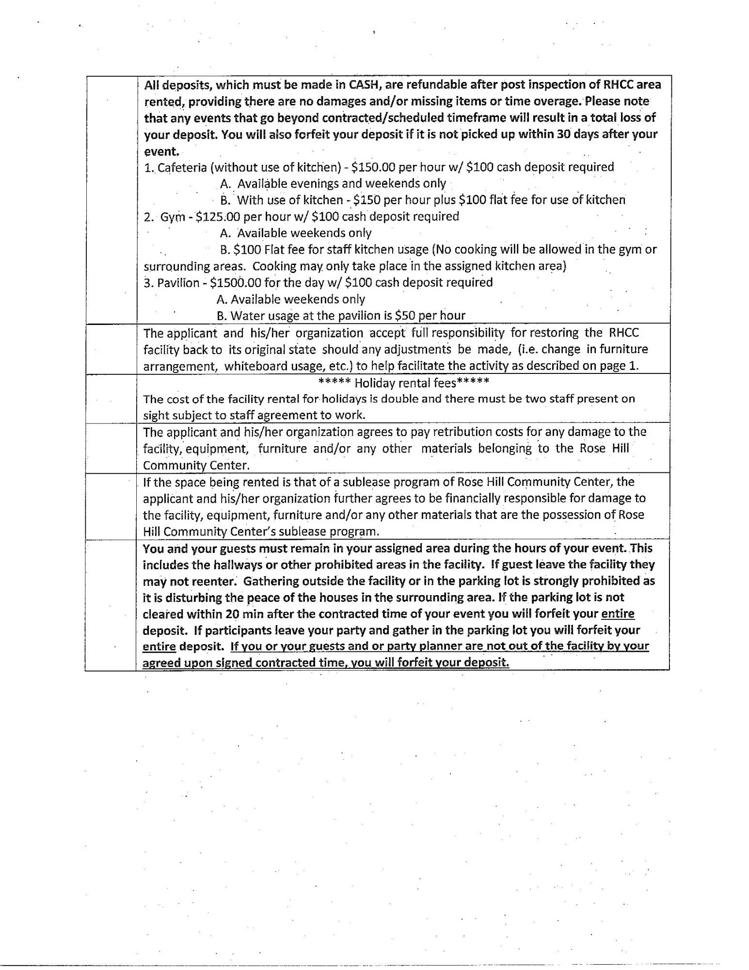 *Deposits are refundable post-inspection of RHCC property providing there are no damages, missing items and you have adhered to your scheduled time. Add additional $25 for use of the kitchen.